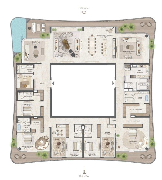 See Burj, Downtown chaos, Gulf’s blue calm—all from your window.