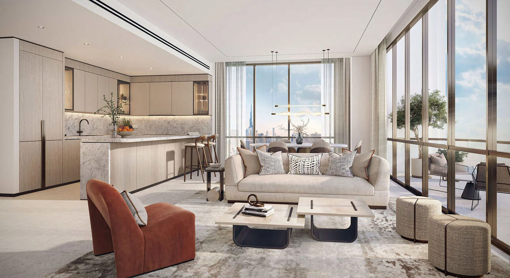 The five-bedroom penthouses rise above it all, featuring soaring double-height living and dining spaces, statement staircases, and expansive private terraces. With panoramic views of the Dubai skyline, lavish bedrooms, and spa-style bathrooms, every detail is crafted to deliver an exceptional lifestyle.